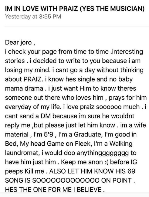 The girl who remained annonymous said she is losing her mind and can’ t go a day without thinking about Praiz. She also said she is a wife material, a graduate and very good in bed.